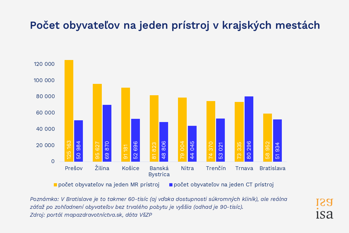 MR vyšetrenia sa používajú na získanie detailných snímok orgánov a tkanív, čo umožňuje diagnostiku ochorení mozgu, chrbtice, kĺbov či vnútorných orgánov. Na Slovensku bolo ku koncu vlaňajška 67 MR prístrojov, všetky len vo väčších mestách. V okresoch ako Prešov, Rožňava či Stropkov pripadá zhruba 120-tisíc pacientov na jeden prístroj. V Bratislave je to takmer 60-tisíc (aj vďaka dostupnosti súkromných kliník), ale reálna záťaž po zohľadnení obyvateľov bez trvalého pobytu je vyššia (odhad je 90-tisíc).